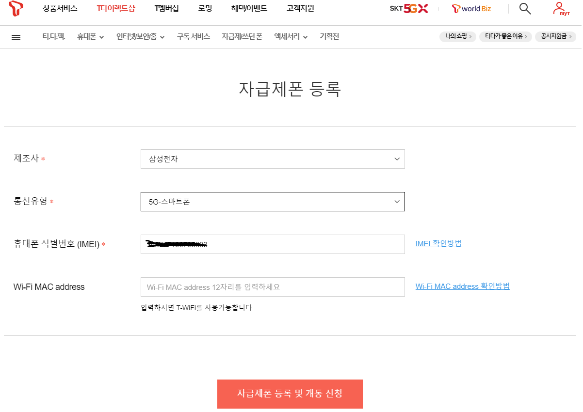 4. 필수 입력 사항 [제조사] [3G, 4G, 5G 구분 선택], [IMEI 번호]를 입력합니다.